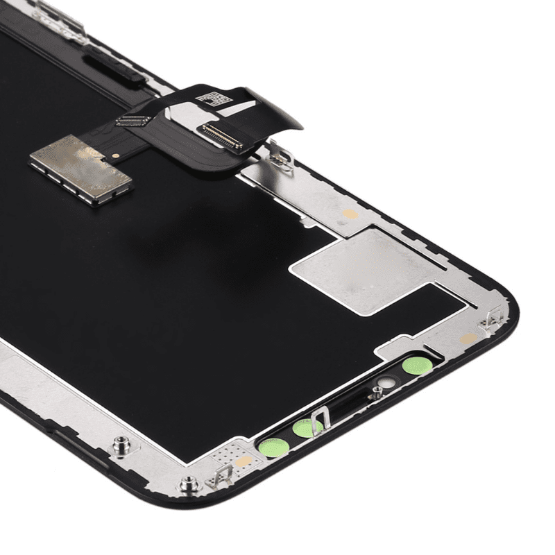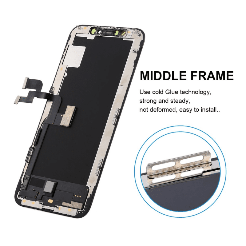 This item Phone XS OLED LCD screen assembly is available in black and includes the LCD screen, digitizer touch screen, and front frame, which means 100% original manufactured and assembled and high quality.