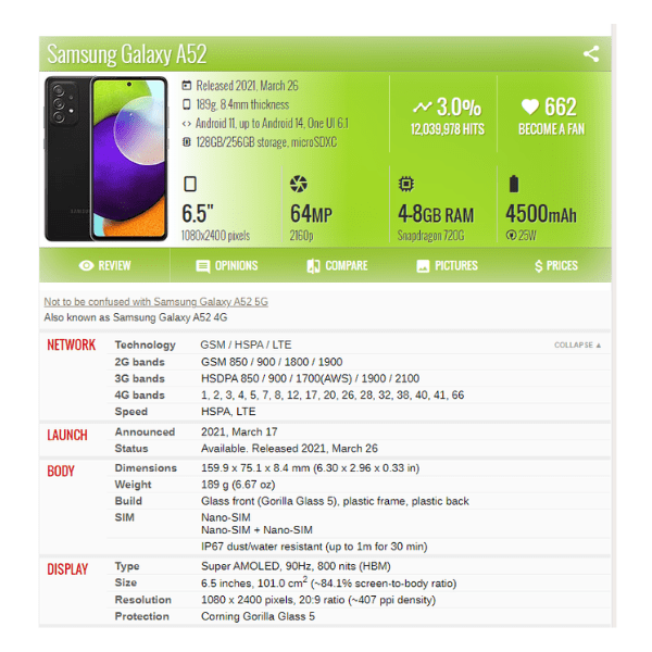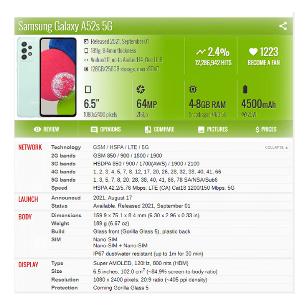 | Modèle de téléphone | SamsungGalaxy A52, Samsung Galaxy A52s |