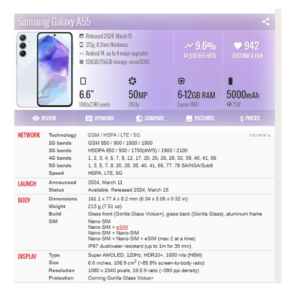 | Múnla Fón | Samsung réaltra A55 |