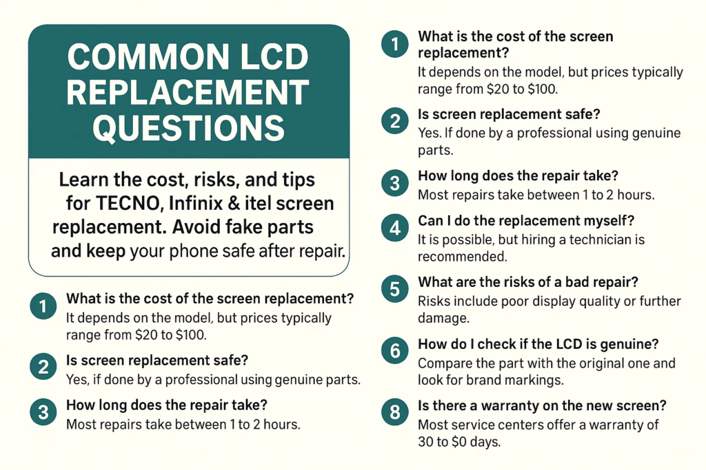 In this guide, we’ll answer the 10 most frequently asked questions about replacing Transsion phone screens. By the end, you’ll know how much it costs, how to avoid fake parts, and how to keep your device in good condition after repair.